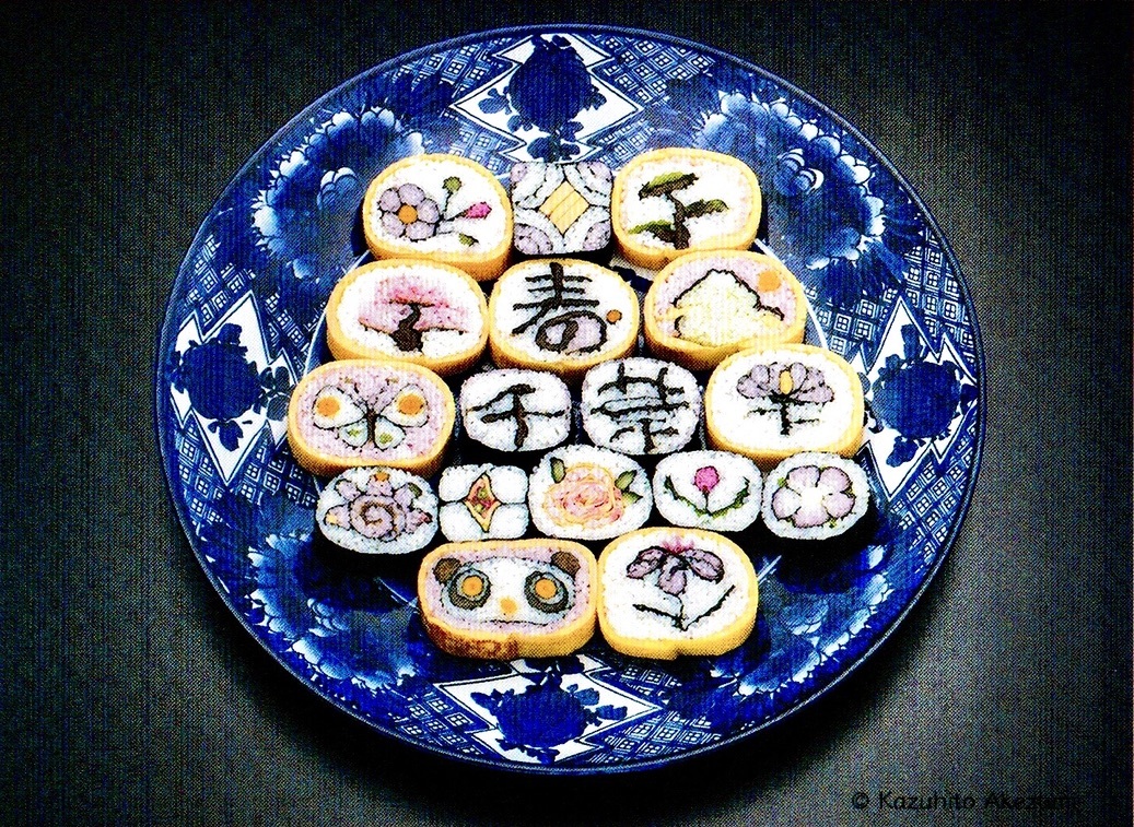 Futomaki Masuri Sushi was created mainly by the farmers in northern Chiba Prefecture for ceremonial purposes.The main ingredients in Futomaki Matsuri Sushi are rice,nori (laver from Tokyo Bay), kanpyo( dried shaving of calabash gourd that can be preserved for a long time),and sakura denbu(pink fish floss than can be bought anywhere).We make thick nori rolls and omelette rolls and arrange them into unique patterns,thereby developing creative methods of handing the bamboo mats.It is a great form of art that was developed by farmers in Chiba.